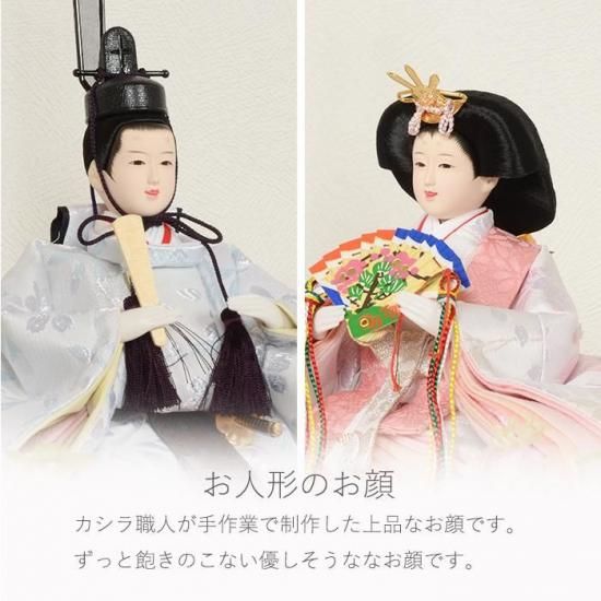 お顔の表情は、お雛様の命。優しい微笑を浮かべたお雛様のお顔は、見ているだけで幸せな気持ちになります。 優しく微笑むお顔が魅力のお人形に、職人が仕立てた豪華絢爛な衣裳を丁寧に着せつけました。お姫様のかさねもボリュームたっぷりで、見応えのある美しい仕上がりご家族皆様でお楽しみいただけるお雛様となっております。