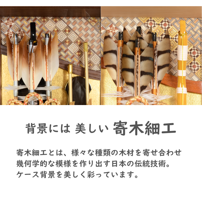 日本の伝統文化を守り、節句の心を伝承させるためにも数少ない天然羽根を用いました。加工羽根では得られない自然の美しさが気品の高さを漂わせます。様々な種類の木材を寄せ合わせ、幾何学的な模様を作り出す日本の伝統技術、寄木細工が背景を美しく彩っています。